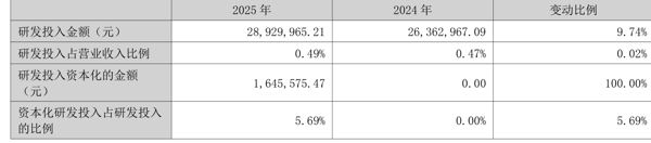 2025年全年,公司研发投入金额为2893万元,同比增长9.74%;研发投入占营业收入比例为0.49%,相比上年同期上升0.02个百分点。此外,公司全年研发投入资本化率为5.69%。
