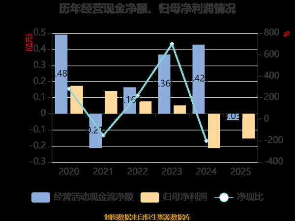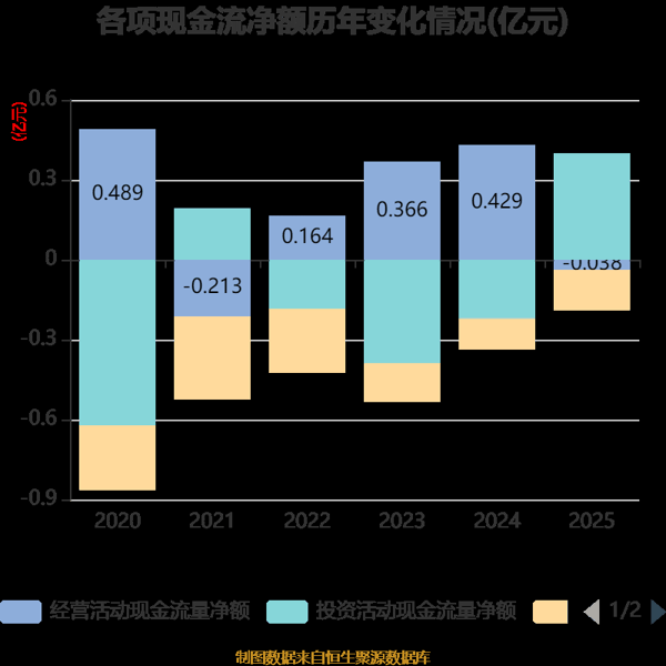 截至2025年,公司经营活动现金流净额为-380.63万元,同比减少4667.46万元;筹资活动现金流净额-1507.53万元,同比减少359.16万元;投资活动现金流净额3990.64万元,上年同期为-2207.31万元。