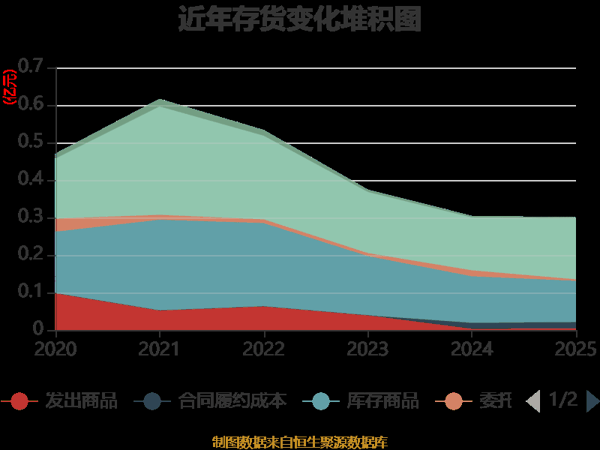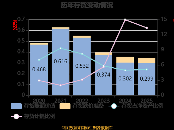 从存货变动来看,截至2025年末,公司存货账面价值为2988.1万元,占净资产的5.12%,较上年末减少36.84万元。其中,存货跌价准备为460.23万元,计提比例为13.35%。