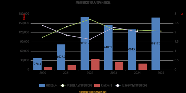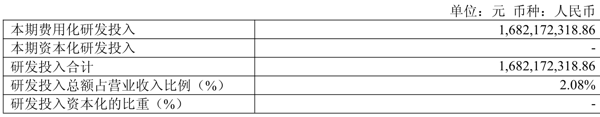 2025年全年,公司研发投入金额为16.82亿元,同比增长29.38%;研发投入占营业收入比例为2.08%,相比上年同期下降0.05个百分点。此外,公司全年研发投入资本化率为0%。