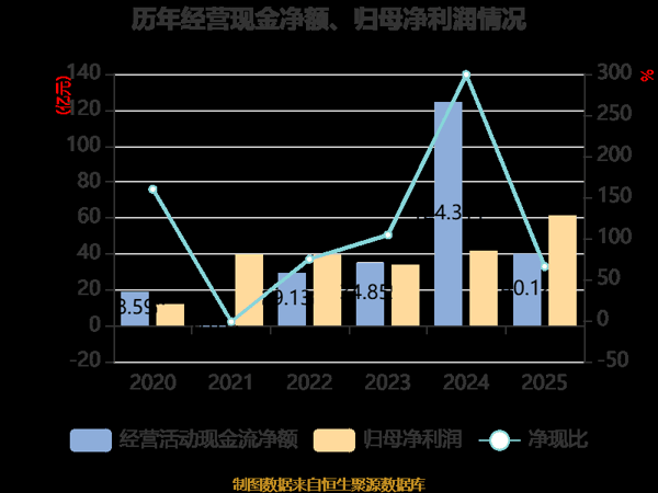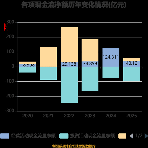 截至2025年,公司经营活动现金流净额为40.12亿元,同比下降67.73%;筹资活动现金流净额19.5亿元,同比增加19.25亿元;投资活动现金流净额-99.19亿元,上年同期为-76.68亿元。