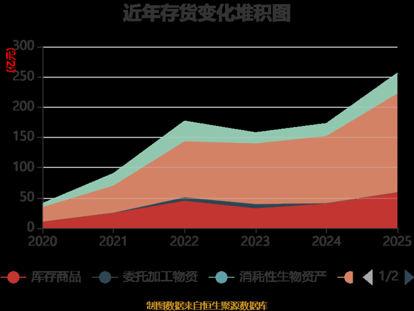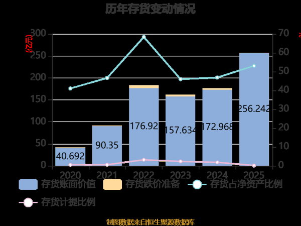 从存货变动来看,截至2025年末,公司存货账面价值为256.24亿元,占净资产的53.06%,较上年末增加83.27亿元。其中,存货跌价准备为3458.23万元,计提比例为0.13%。