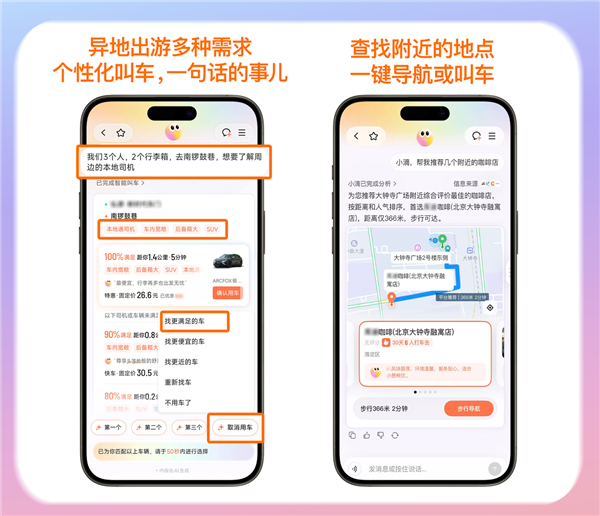 小滴目前已支持90多个服务标签,还可自动匹配高铁/航班时间推算叫车时机、筛选后备箱大的车型、寻找本地通司机,还能查询周边美食景点并一键叫车。
