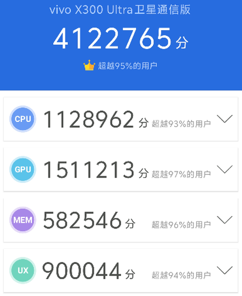 作为一款旗舰级手机,性能与续航是基础体验的保障。vivo X300 Ultra搭载了第五代骁龙8至尊版处理器,搭配冰脉流体VC散热与蓝海续航系统,在性能释放与续航表现上都做到了同级别顶尖水平。安兔兔跑分可以达到412万,位列当下第 一梯队。