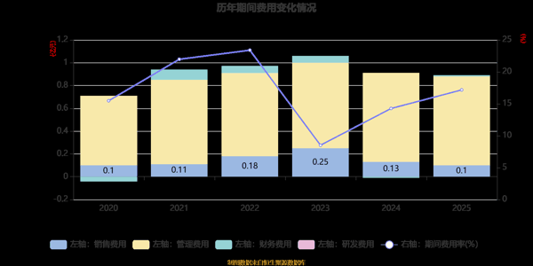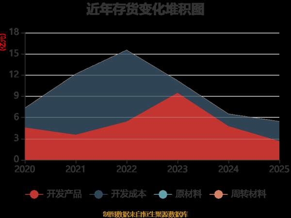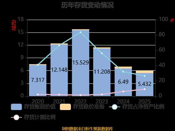 从存货变动来看,截至2025年末,公司存货账面价值为5.43亿元,占净资产的26.45%,较上年末减少1.06亿元。其中,存货跌价准备为5383.6万元,计提比例为9.02%。