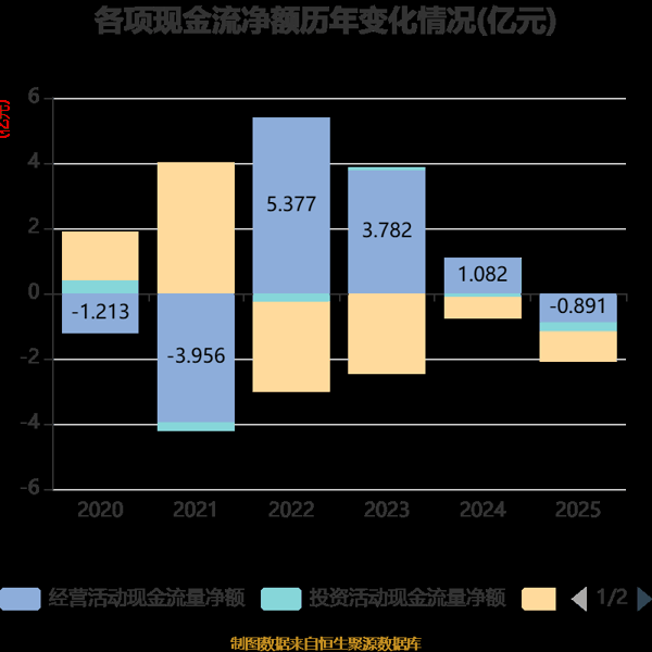 截至2025年,公司经营活动现金流净额为-8908.93万元,同比减少1.97亿元;筹资活动现金流净额-9143.01万元,同比减少2563.41万元;投资活动现金流净额-2761.14万元,上年同期为-1099.97万元。