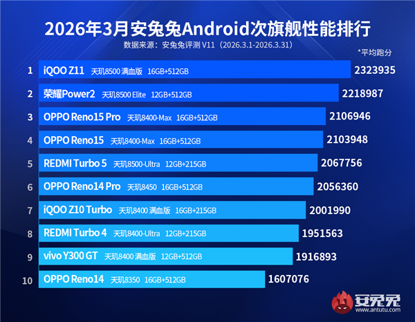 次旗舰手机性能榜的竞争同样激烈,iQOO Z11搭载天玑8500满血版以2323935的平均跑分拿下第一,荣耀Power2、OPPO Reno15 Pro分列二、三位,天玑8500系列处理器成为次旗舰市场的核心配置,展现出不俗的性能表现。