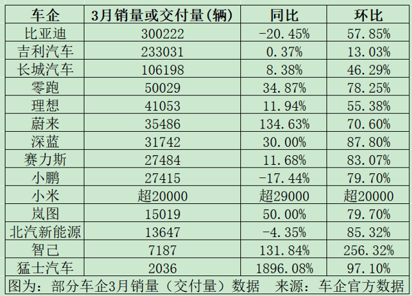 4月1日晚间,多家车企披露的3月销量(交付量)凸显暖意,其中 比亚迪 反超 吉利汽车 ,月度销量再次迈过30万辆大关。