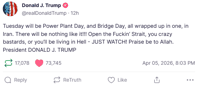 “最终期限”是美国东部时间周一(4月6日)晚上8点,而根据其最新社交媒体的信息,这一