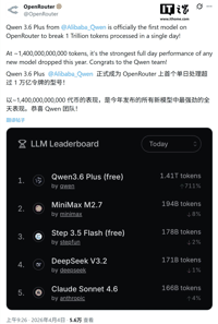 2026-04-04 [阿里] 1.4万亿词元!阿里Qwen 3.6-Plus刷新全球最大AI聚合平台OpenRouter日调用量纪录
