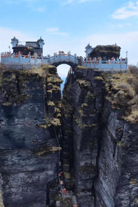 天梯是通往金顶的必经之路,位于“一线天”旁,由数百级铁制阶梯镶嵌在绝壁上构成,最窄处仅能容一人通行,外侧仅有一道铁锁链作为防护。
