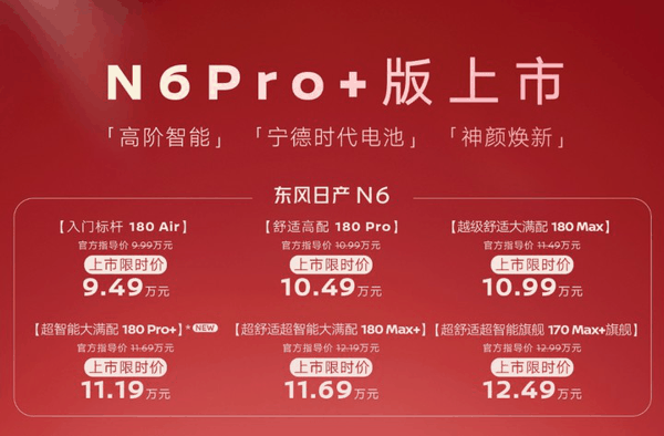 此外日产 N6 此次增加了一个 11.19 万元的 180Pro+ 版本,这个版本和 180MAX+、170MAX+旗舰版一样,全部搭载宁德时代电池,以及东风日产与 Momenta 定制开发的组合驾驶辅助,包括了高速领航驾驶辅助、同级唯一 Momenta 泊车辅助,以及同级首个城市记忆领航辅助,是同级唯一同时搭载宁德时代电池与 Momenta 高阶驾驶辅助的插混车型。