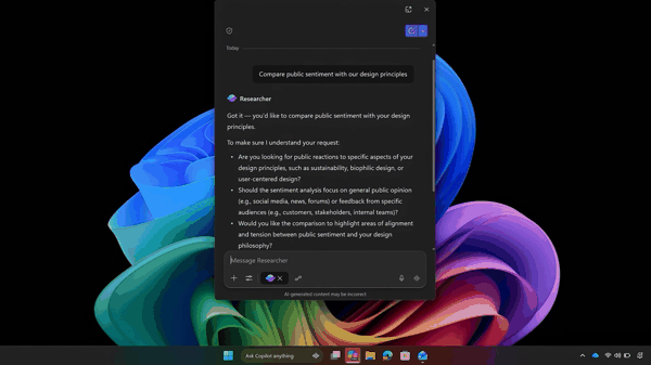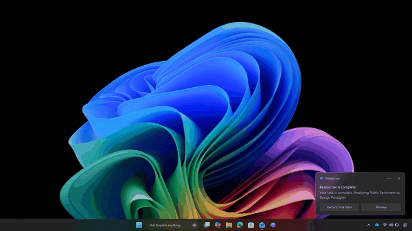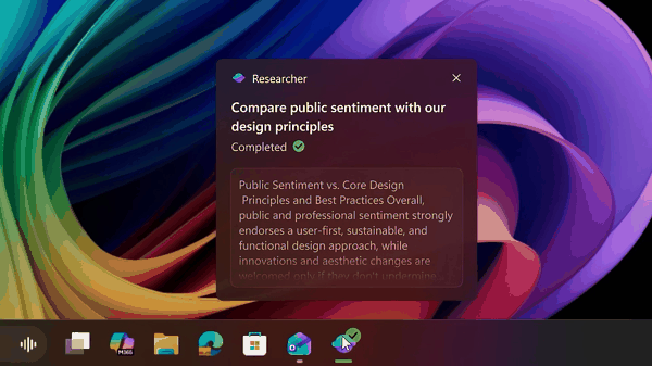 任务栏会显示类似文件下载的进度指示器,用户无需打开浏览器即可监控任务状态。任务完成后,图标旁会出现绿色对勾,用户可直接查看摘要或跳转至 Copilot 应用深入分析。