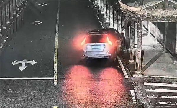 监控画面显示,6日晚10时许,一辆车右拐上桥时出现意外,在不慎碰到了马路牙子后突然加速冲破了一旁的护栏,随后掉入河道。