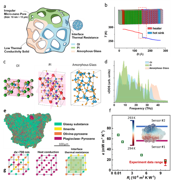 研究还揭示了胶结物超低热导率的物理机制:其非晶态熔融玻璃胶结矿物碎屑的复合结构,叠加纳米至微米级多级孔隙,显著增强声子散射与界面热阻,且热导率更依赖孔隙连通性和结构复杂度;不同物相间的振动态不匹配,让等效界面热阻提升三个数量级,使胶结物热导率仅为理想致密矿物的12%。