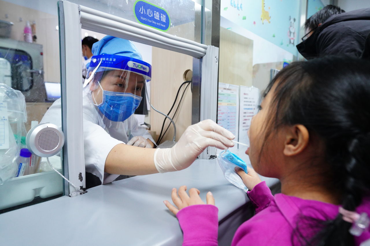 北京儿童医院的医务人员正在为患儿进行病原学检测。新华社|图