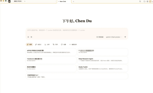 它有一个 AI 对话界面,底层可以接 Gemini 或其他模型。这么看来它有点像 Claude 的桌面端,但又比 Cowork 多一些更直观的操作逻辑。