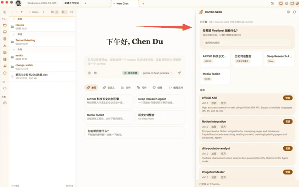 比如你每周都要做一件事:从网上抓几篇行业报告,提炼摘要,整理成 Markdown 文档,然后推送到 Notion。你第一次在 Floatboat 里手动跟 Agent 对话完成了这套流程之后,对话框下方会出现一个按钮,问你要不要把这轮操作存成一个 Combo。