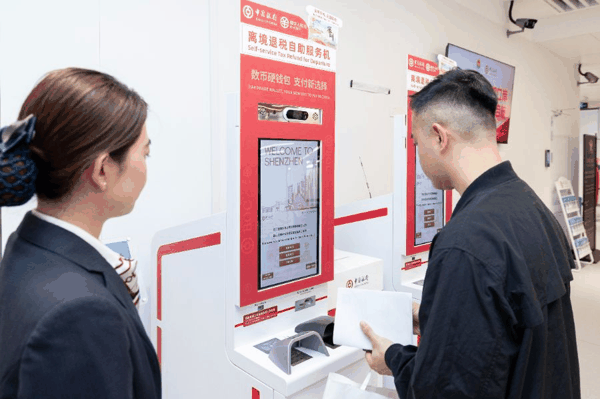 (图:入境游客正在使用自动离境退税终端,图源: 中国银行 深圳市分行)