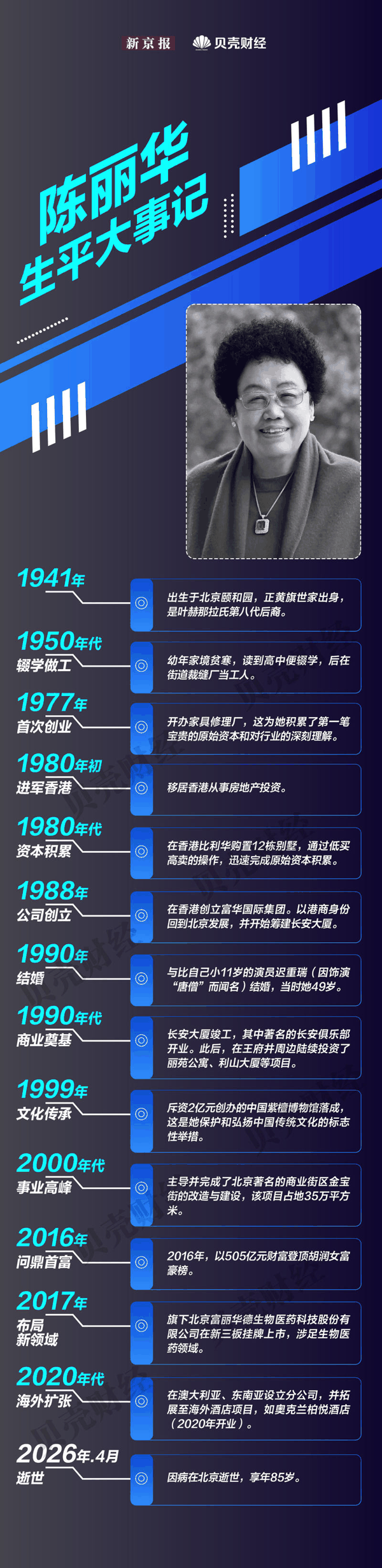 4月7日,富华国际集团发布讣告,富华国际集团荣誉主席、中国紫檀博物馆馆长陈丽华女士因病医治无效,于2026年4月5日在北京逝世,享年85岁。