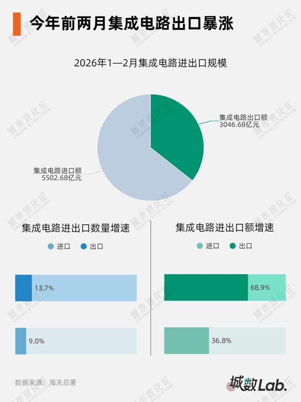 集成电路作为我国最大的外贸单品,进出口更呈现爆发式增长:1—2月,我国集成电路出口额3046.68亿元,同比增长68.9%;进口额5502.68亿元,同比增长36.8%。