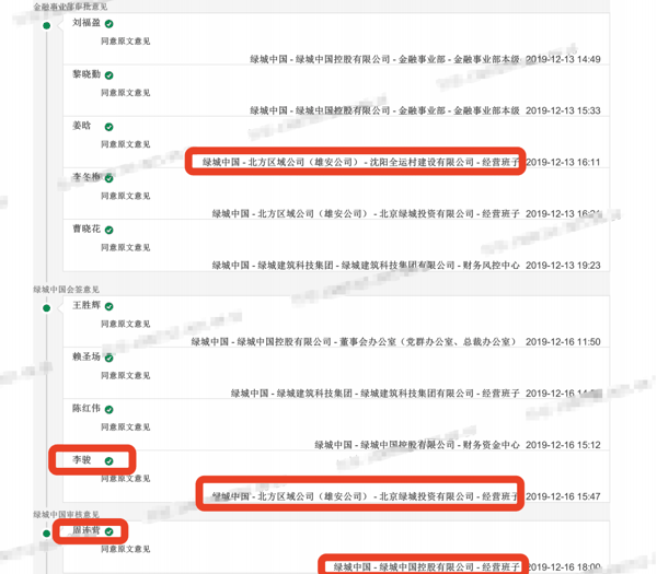 天鸿地产提供的相关文件显示,沈阳全运村在绿城中国OA审批系统中,属于绿城中国北方区域公司(雄安公司)旗下经营班子,2019年沈阳全运村同天鸿地产的合作,由绿城中国时任执行董事、执行总裁兼 综合 产业投委会主任周周连营(已被免职)、现任执行董事李俊审批通过。