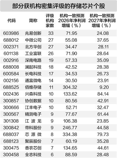 获评级机构家数最多的是 兆易创新 ,共有33家机构评级,机构一致预测该股2026年、2027年净利润增长率分别达到71.95%、24.08%。