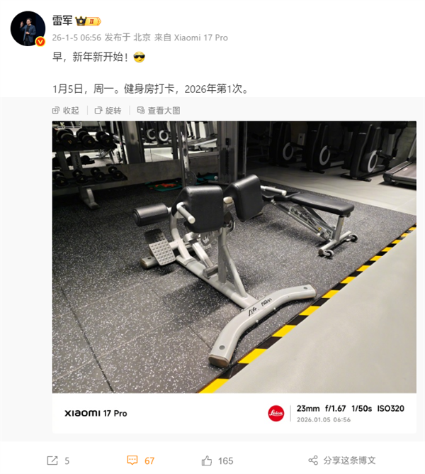 快科技1月5日消息,今早不到7点,小米创办人,董事长兼CEO雷军已经开始了2026年的第一次健身房打卡。