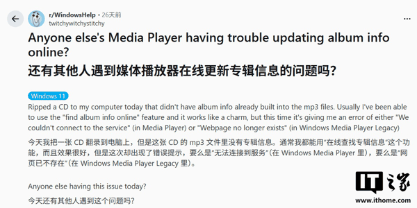 IT之家 1 月 11 日消息,科技媒体 borncity 今天发布博文,报道称微软似乎已经关闭 CD 媒体数据服务器,导致 Windows Media Player 无法抓取、搜索 CD 的专辑名称、歌曲名、艺人信息。