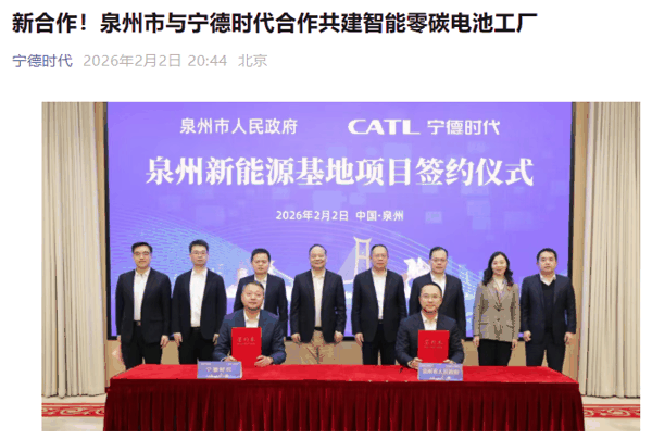 IT之家 2 月 2 日消息,今日,泉州市人民政府与宁德时代正式签署新能源电池生产基地项目合作协议。