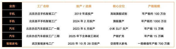 图:2025年10月投产的小米武汉智能家电工厂,峰值年产能达700万台空调,每6.5秒即可下线一台 这座工厂的意义,在于让小米第一次在“冷家电”上拥有了从研发、试制到量产的完整闭环。它和北京亦庄的汽车工厂、昌平的手机工厂一起,构成人车家三条线背后的制造底盘。家电这条线原本被视作手机生态的延伸,2025年开始,它自己也有了足够的业务体量和技术含量,可以在财报里成为单独讨论的支柱板块。