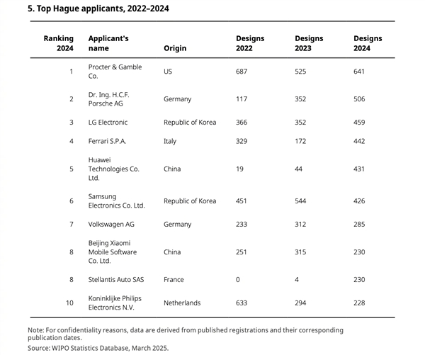 除了两款产品被收录百年纪念画册之外, WIPO披露的《2025年海牙年鉴》还显示,2024年小米国际外观设计(海牙体系)排名全球第8,是TOP10中唯二的中国公司。