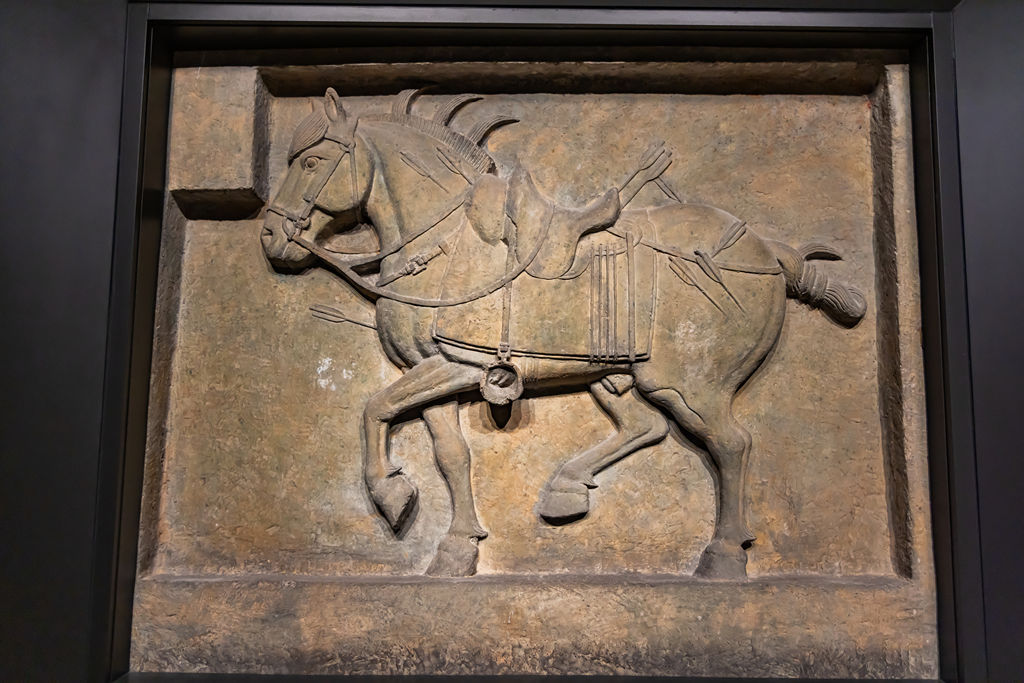2025年11月,西安碑林博物馆“昭陵六骏专题展”,其中“四骏”为原件,飒露紫和图中的拳毛䯄为复制件,原件现藏于美国宾夕法尼亚大学考古学及人类学博物馆。视觉中国丨图