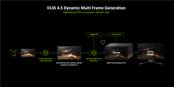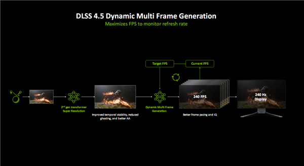 DLSS 4.5带来了两方面的重大升级,一是6倍多帧生成,二是升级至第二代Transformer模型的超分辨率。