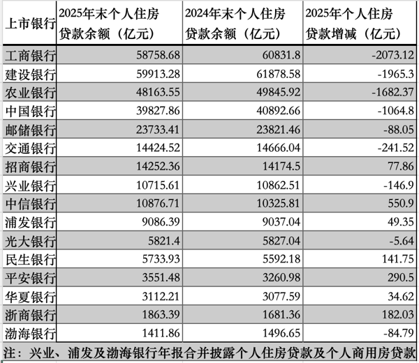 澎湃新闻根据国有六大行和上市股份行2025年年报统计发现,作为按揭贷款发放主力军,国有六大行的个人住房贷款余额去年均出现减少,10家上市全国性股份制 银行 (招行、兴业、中信、民生、浦发、光大、平安、华夏、浙商、渤海)中,7家增长,3家减少。