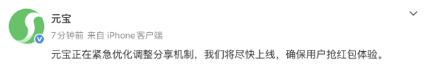 被微信屏蔽后,元宝官方账号随后发文回应称:正在紧急优化调整分享机制,我们将尽快上线,确保用户抢红包体验。