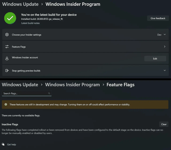 而在 Windows 11 Build 26300.8155 版本中,微软隐藏了“功能标记”页面, 页面列出可用功能及已结束推出的功能 ,并提示操作可能引发系统不稳定,为用户提供官方、直观的管理入口。