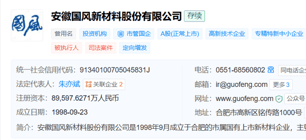 天眼查显示,国风新材成立于1998年9月,是合肥市属国有新材料企业,1998年11月在深交所主板上市,主要聚焦高分子功能膜材料、光电新材料、聚酰亚胺材料、绿色环保木塑新材料、新能源汽车轻量化材料等五大产业,是国家高新技术企业。