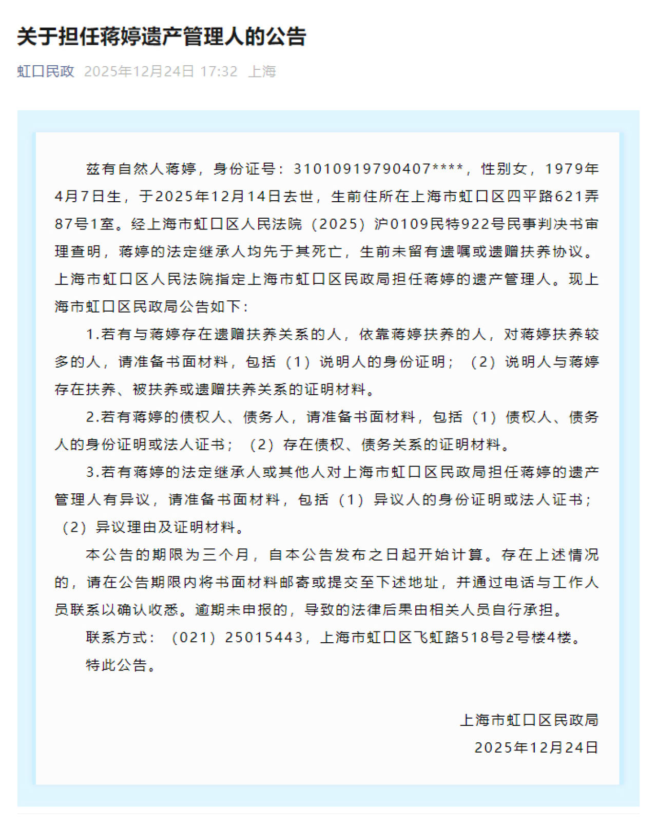 《关于担任蒋婷遗产管理人的公告》(图:上海市虹口区民政局)