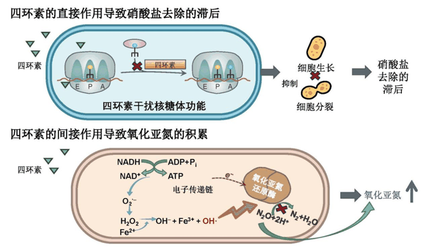 研究团队以典型反硝化细菌为对象,模拟环境中常见浓度的四环素类抗生素暴露情况。结果发现,即使在不足以杀死细胞的低浓度下,抗生素仍能显著延缓硝酸盐的去除过程,并大幅增加氧化亚氮的排放。通过酶活测定、细胞生理与转录组学分析,研究团队发现抗生素通过抑制蛋白质合成、干扰葡萄糖代谢与电子传递,导致细胞内部氧化还原失衡和活性氧积累,进而优先抑制了还原氧化亚氮的酶活性,造成氧化亚氮积累。