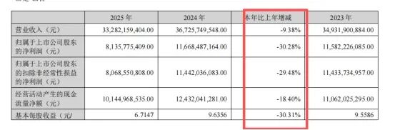 此外,在利润大幅下滑之际,公司2025年度累计现金分红高达53.10亿元,占净利润比例达65.27%,维持了较高的分红比例。