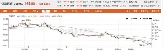 当业绩“神话”破灭,投资者开始用脚投票。近一年来, 迈瑞医疗 的股价阴跌不止,从2025年8月的254元高点一路波动走低,跌幅超30%,市值缩水超千亿。截止4月1日收盘,迈瑞医疗报于165.9元/股,总市值为2011亿元。