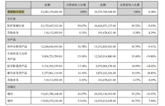 具体业务来看, 体外诊断 业务报告期内实现营收122.41亿元,同比下降9.41%。这是公司第一大业务,占集团营收比重超36%,其中国内体外诊断收入占国内业务比重约48%。