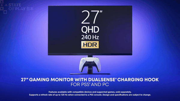 同时,索尼还公布了一款 PlayStation 游戏显示器,内置 DualSense 无线控制器的充电挂钩,采用 27 英寸 QHD 面板,支持 240Hz 刷新率(连接 PS5 时最高支持 120Hz),支持 VRR。
