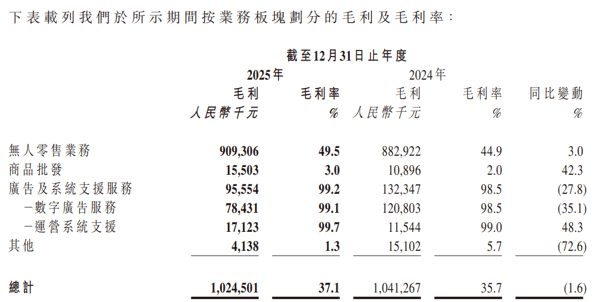 截至2025年12月31日止年度,公司录得 综合 毛利约人民币10.245亿元,同比减少1.6%。截至2025年12月31日止年度,公司的 综合 毛利率为37.1%,同比增加1.4个百分点。毛利及毛利率的同比变动主要由于于无人零售业务中开发高利润点位,以及公司旨在降低成本的发展策略。