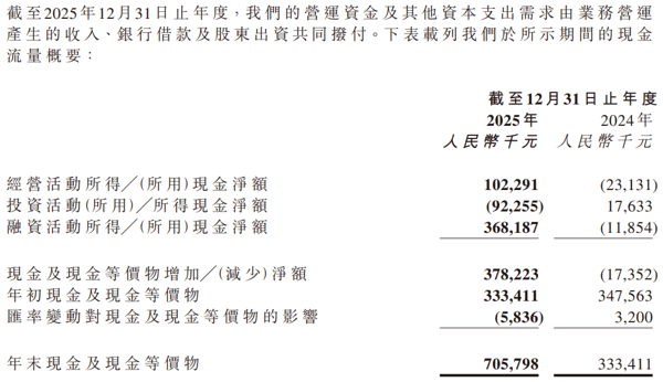 截至2025年12月31日止年度,经营活动所得现金净额约为人民币1.023亿元,主要归因于相关期间经营亏损减少及经营付款下降。截至2025年12月31日,公司主要以人民币持有的现金及现金等价物,由截至2024年12月31日的约人民币3.334亿元增加111.7%至截至2025年12月31日的约人民币7.058亿元。