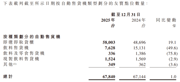截至2025年12月31日,友宝点位的数量为67,840个,同比增加1%;公司的点位合伙人(不包括餐厅模式合伙人)数量为2,175名,同比增加2.9%;非友宝点位的数量为15,513个,同比减少1.5%。