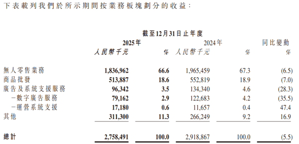 ·无人零售业务。截至2025年12月31日止年度,公司来自无人零售业务的收益约为人民币18.37亿元(占集团总收益27.58亿元比重为66.6%),同比减少6.5%。该减少主要由于于报告期间内,公司淘汰低利润点位及开发高利润点位的策略导致部分点位流失。