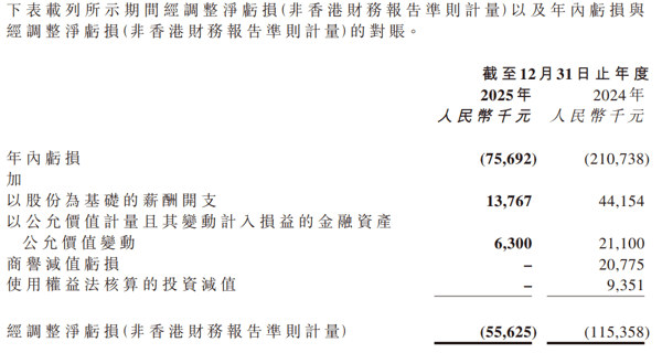 公司将经调整净亏损定义为经加回:以股份为基础的薪酬开支;以公允价值计量且其变动计入损益的金融资产公允价值变动;商誉减值亏损;及使用权益法核算的投资减值作出调整的年内亏损。公司剔除该等项目,原因是其性质乃属非经营性、非经常性,或无法反映公司的核心经营业绩。以股份为基础的薪酬开支性质属非现金项目,且不会导致现金流出。以公允价值计量且其变动计入损益的金融资产公允价值变动性质属非现金项目,且与公司的业务运营并无直接关联。商誉减值亏损及使用权益法核算的投资减值亏损均属非现金项目,且与公司的业务运营并无直接关联。
