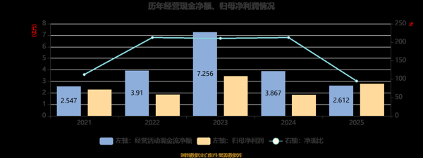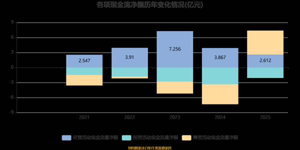 2025年,公司经营活动现金流净额为2.61亿元,同比下降32.45%;筹资活动现金流净额4.77亿元,同比增加8.71亿元;投资活动现金流净额-2.07亿元,上年同期为-3.37亿元。